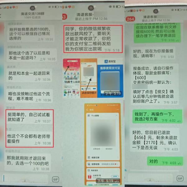 经了解,张先生此前花2980元购买了一款投资搭理课程,因合计后果不睬念念肯求退款。不久,他接到自称某“基金客服”的电话,称退费业务已转至其公司办理,但需要下载指定App并加入“退费群”。群内有不少“学员”共享“告捷退费告诫”,张先生徐徐减弱了警惕。